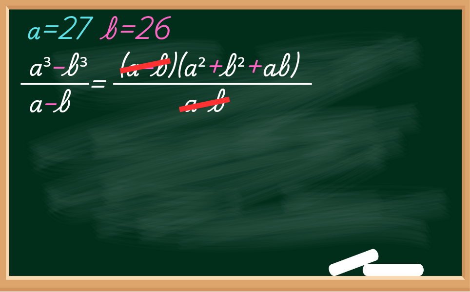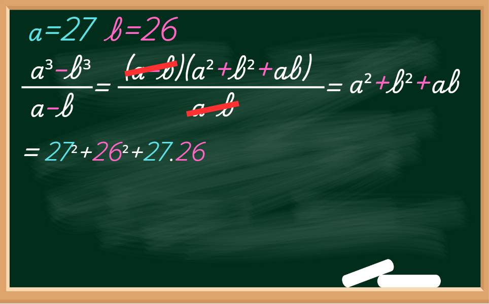 Como a ideia é diminuir o número de cálculos e, pode parecer algo difícil, mas vai te economizar tempo durante a prova do vestibular. Logo, vamos utilizar a fórmula da Diferença de Dois Cubos, que diz o seguinte: a³-b³=(a-b)(a²+b²+ab) e substituir na expressão.
