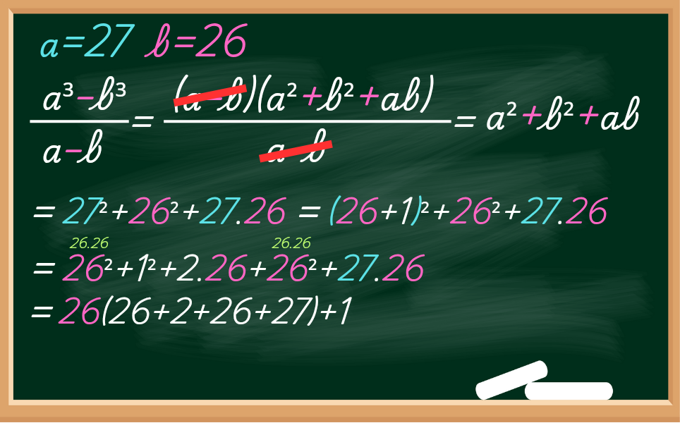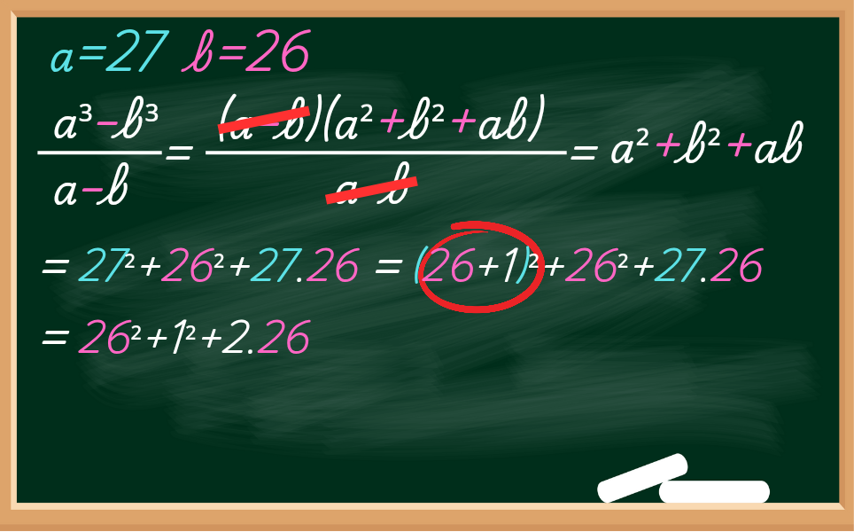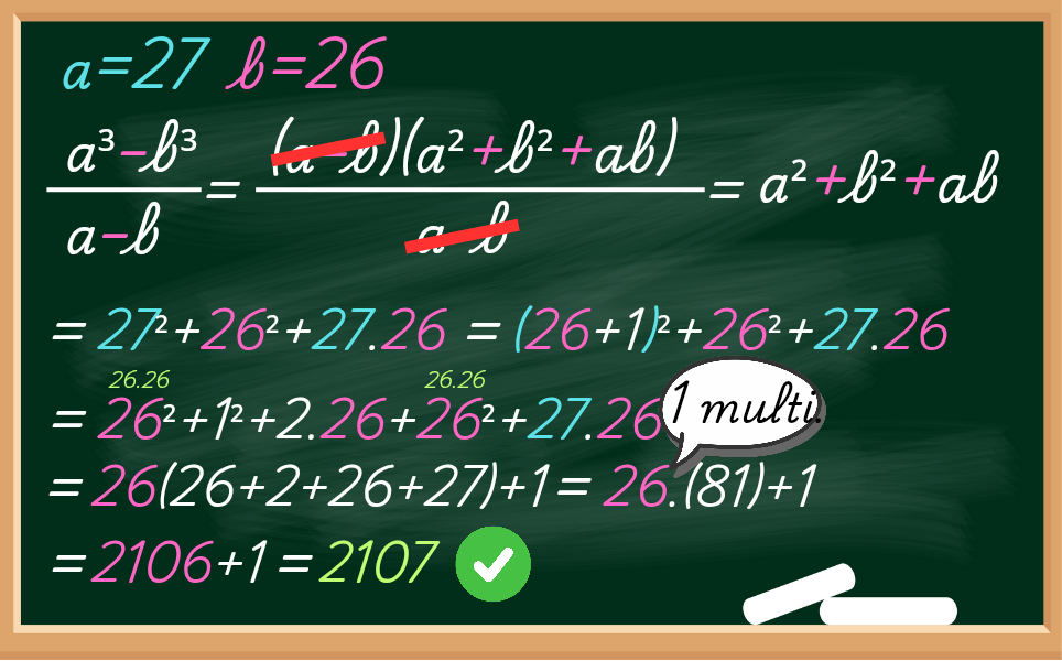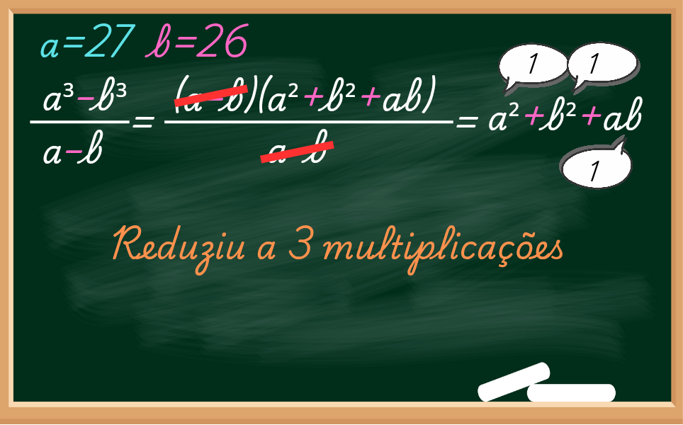 Claro que podíamos substituir o valor de a (a=27) e b (b=26) na expressão, porém teríamos que multiplicar 6 vezes, pois o faríamos 3 multiplicações e para o mais 3 multiplicações.