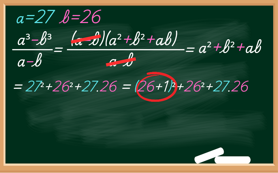 Como temos (26+1)², basta calcular o quadrado de um binômio, o que resulta em 26²+1²+2.26. Já o resto dos números da expressão é só descê-los.