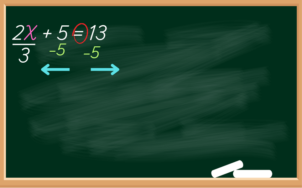 E agora, como sumir com estes números? Daí a importância de saber o inverso das operações. Para começar, seria legal eliminar um dos números que estão em torno do X e, com uma baita dica, começa sempre com os números que estão somando ou subtraindo, neste caso, vamos começar eliminando o +5.