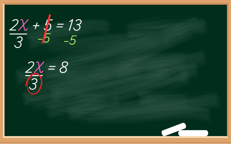 Temos o 2 e o 3 em torno do X, para eliminar eles, podemos começar com o 3 e, como o 3 está dividindo o X, isto é, sempre que o número estiver debaixo da variável, isto é, debaixo da letra, significa que o número 3 está dividindo o X.