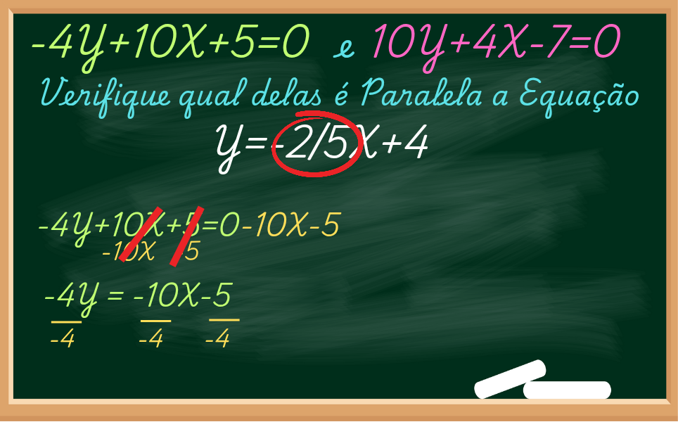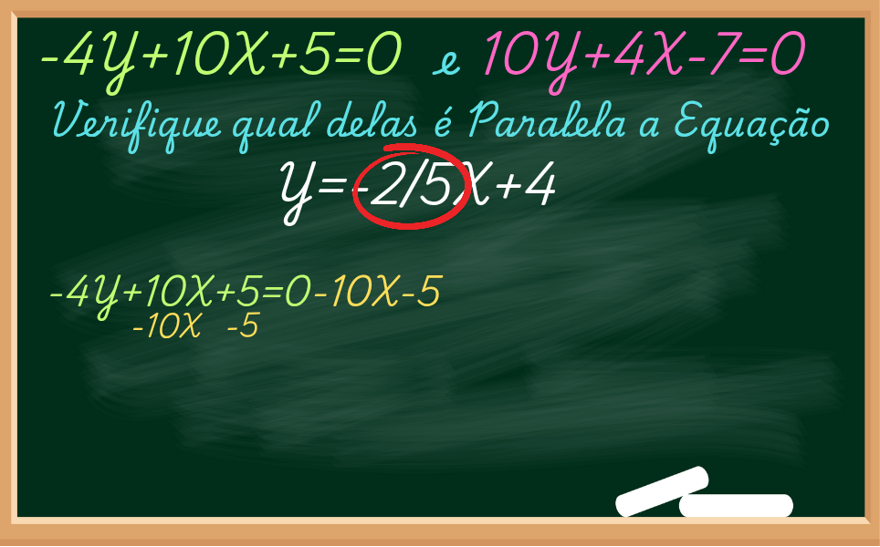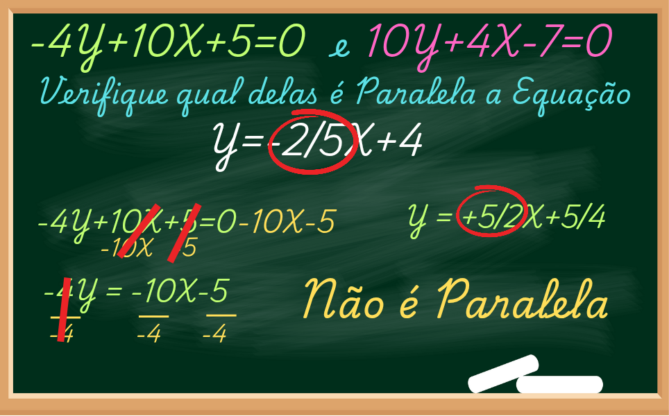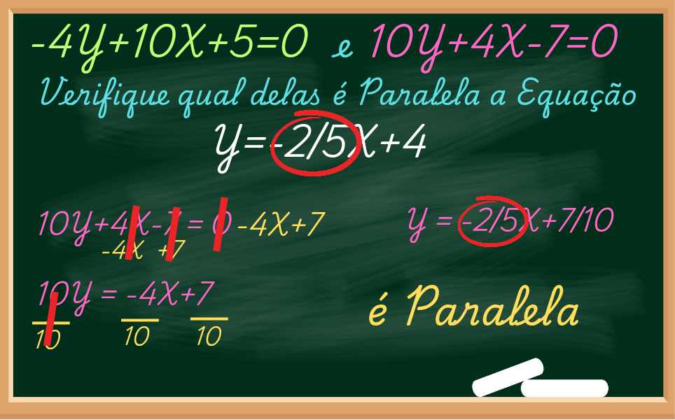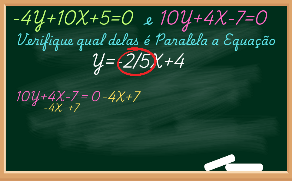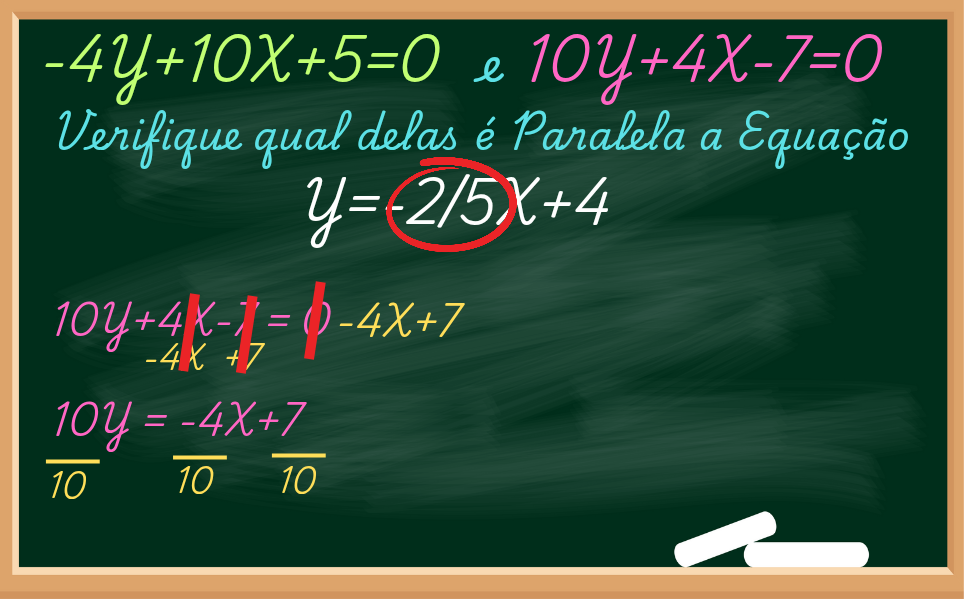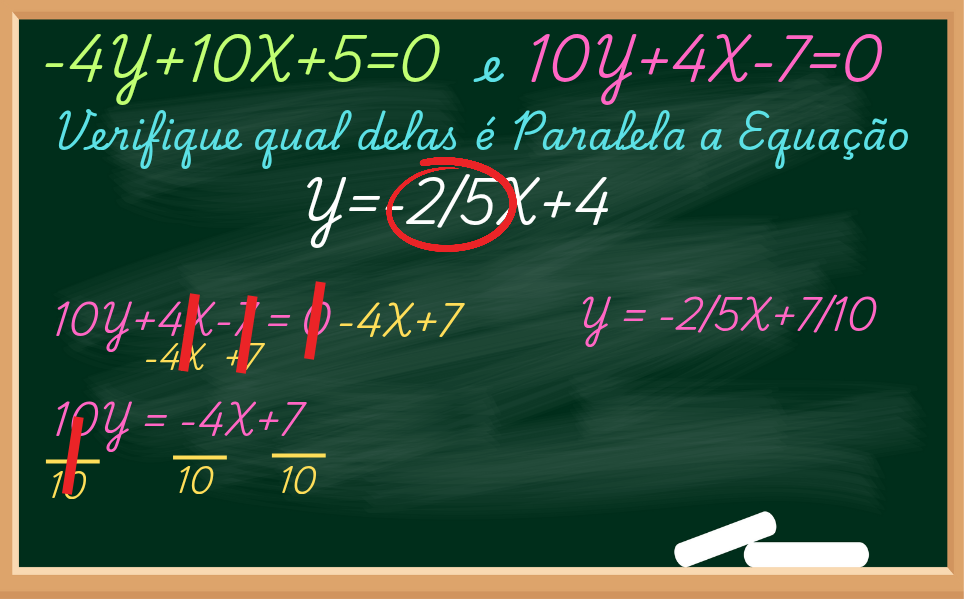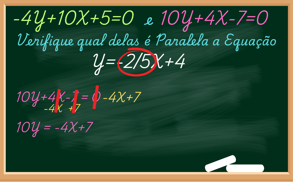 Olhando o coeficiente angular da nova reta encontrada (-2/5), é exatamente o mesmo da equação y=-2/5x+4, o que significa que 10y+4x-7=0 É PARALELA A y=-2/5x+4.