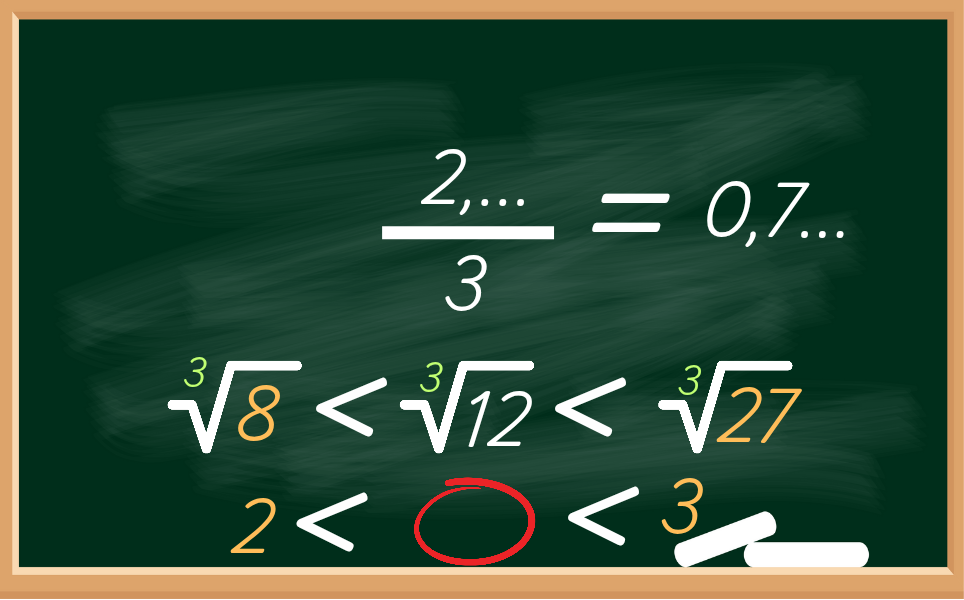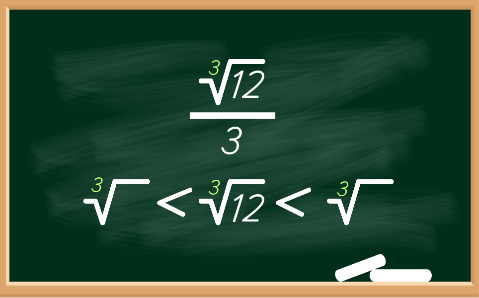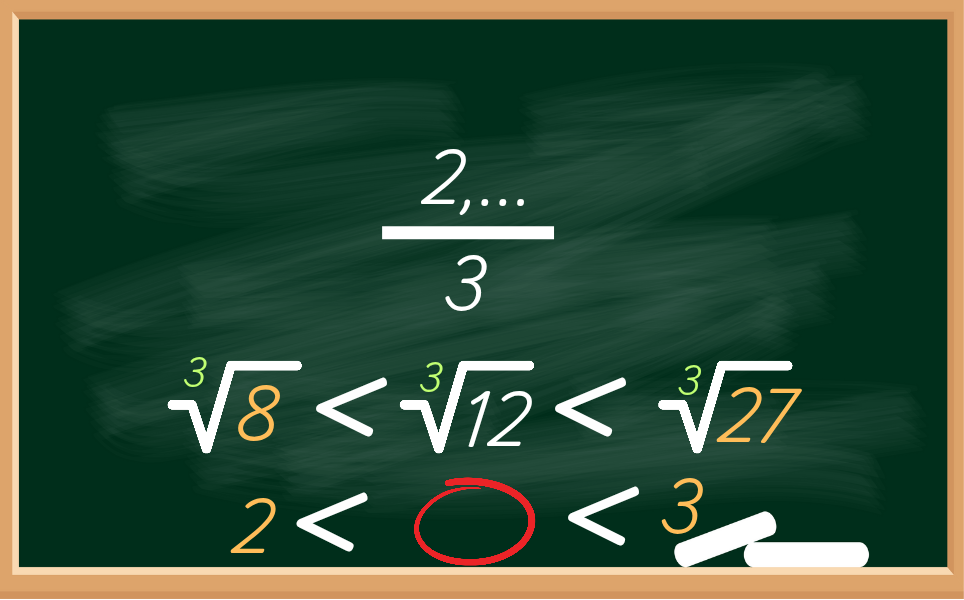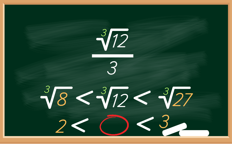 Como o valor está entre 2 e 3, então raiz cúbica de 12 é um número 2,… (dois vírgula alguma coisa) e já que o 8 está mais próximo de 12 ao invés de 27, podemos deduzir que o número está entre 2 e 2,5 (podes utilizar até um 2,3 se quiser, não vai fugir muito do resultado).
