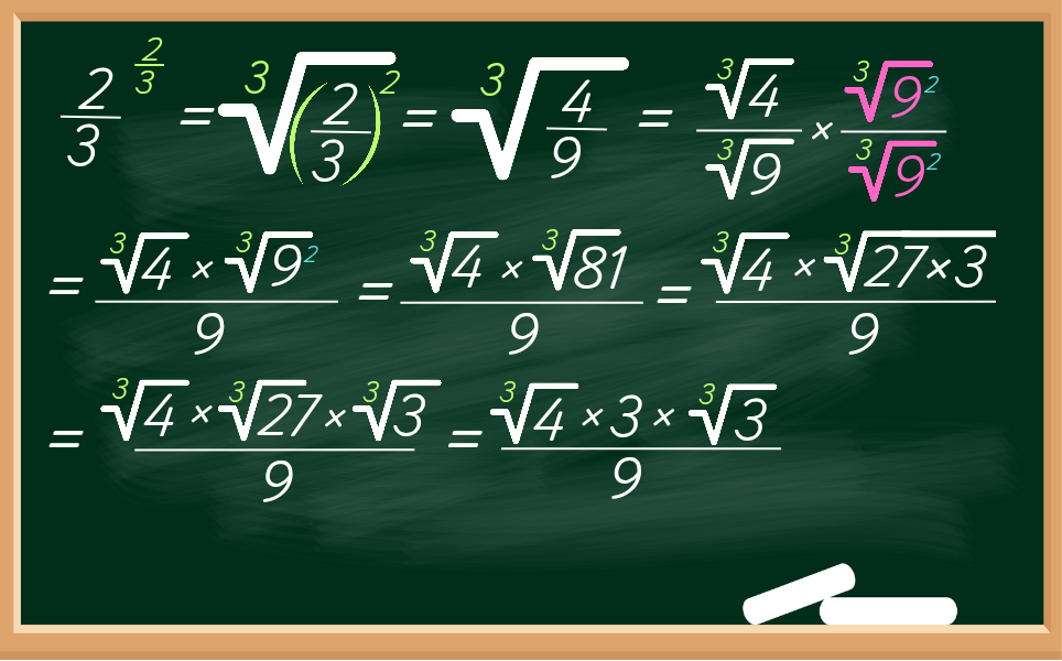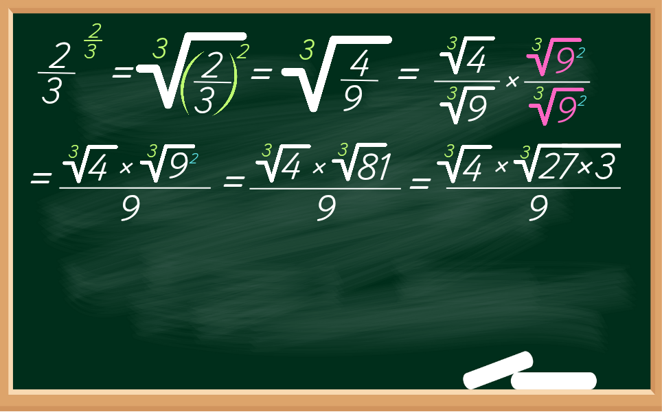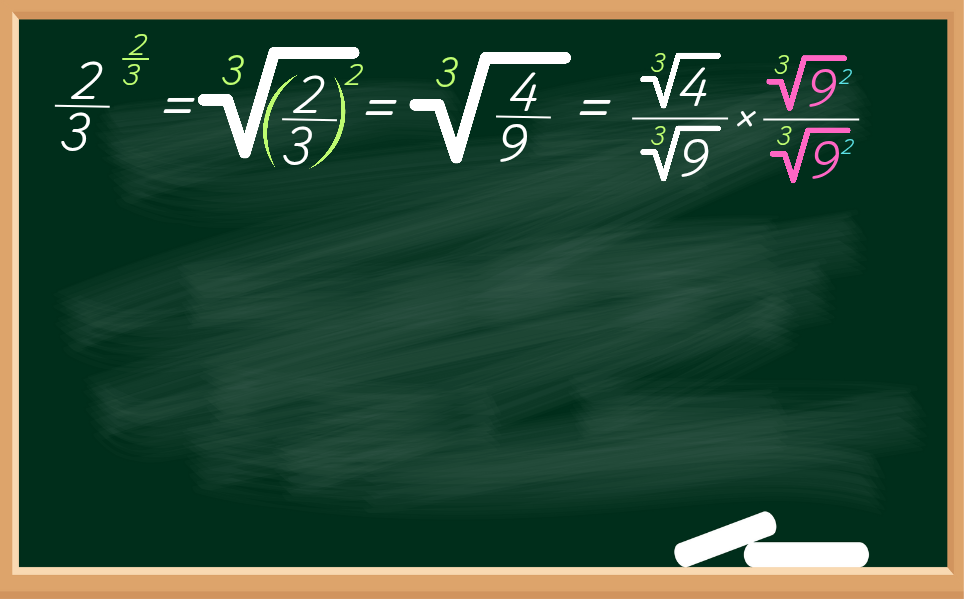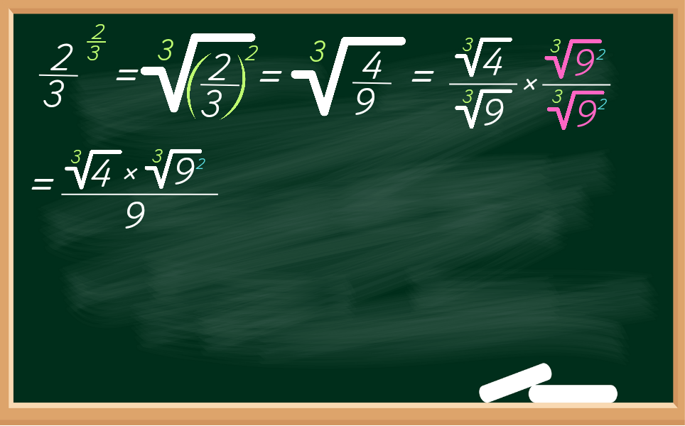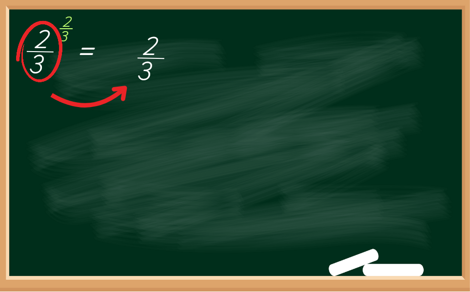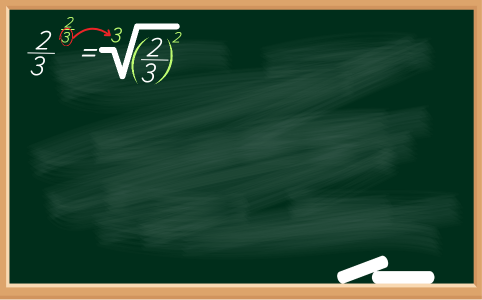 Para começar a calcular uma potência com um expoente fracionário, o interessante é transformar esta potência em raiz. A primeira coisa que tu tens que fazer é repetir a base desta potência, neste caso o 2/3.