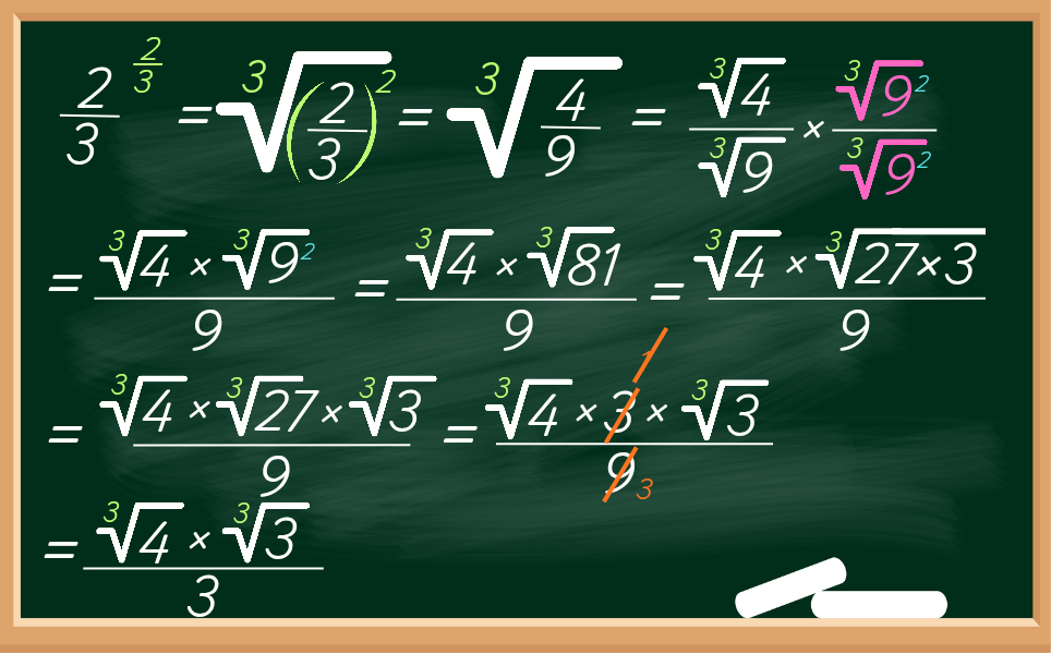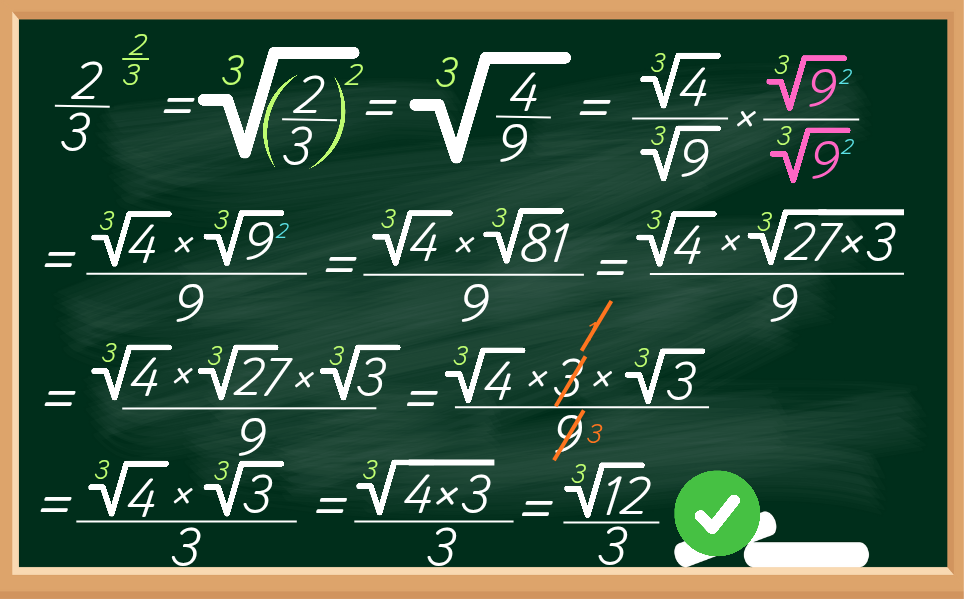 Olhando o expoente, como é uma fração, o numerador (2), tu vais colocar como expoente do 2/3 repetido. Como o denominador é 3, este será o índice da raiz formada.
