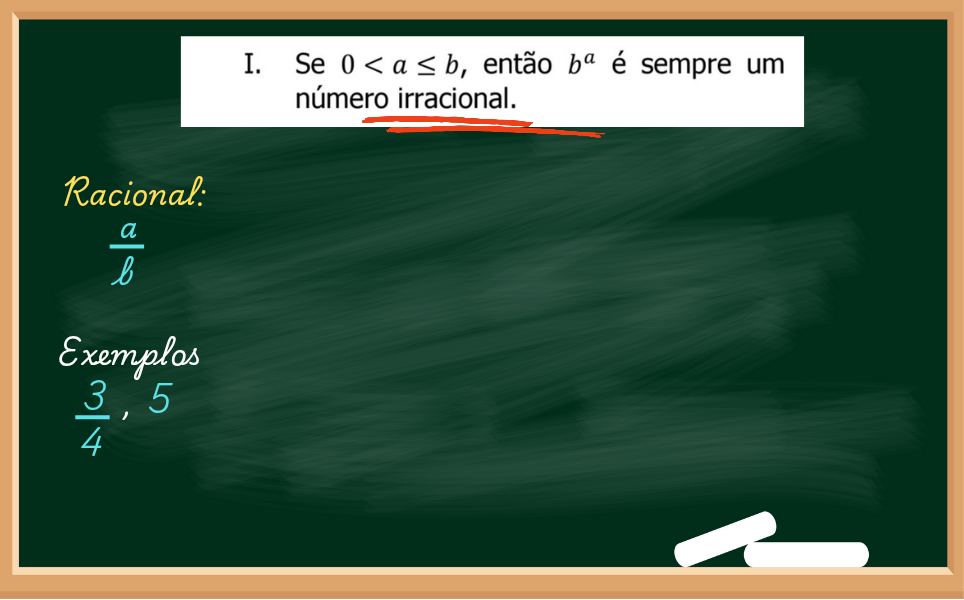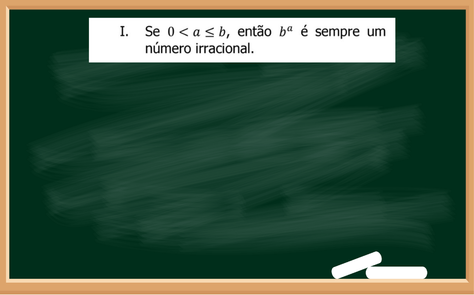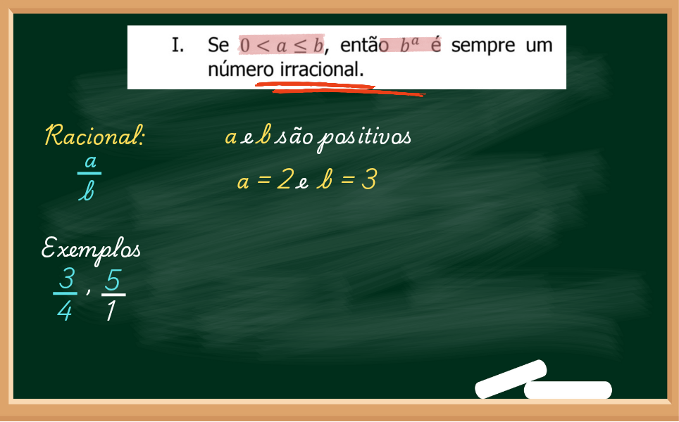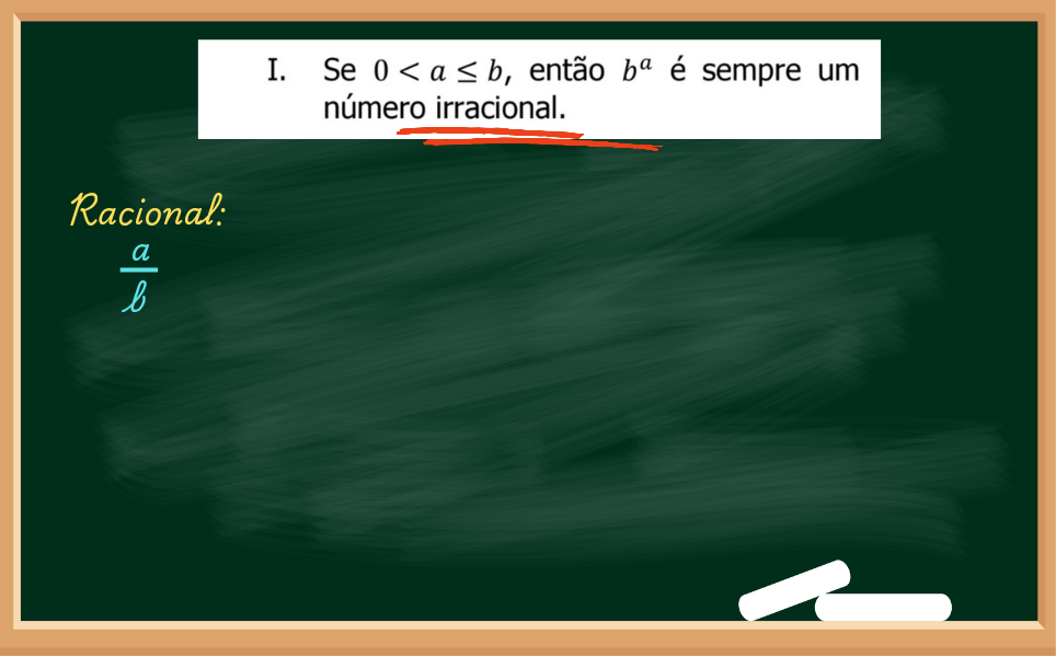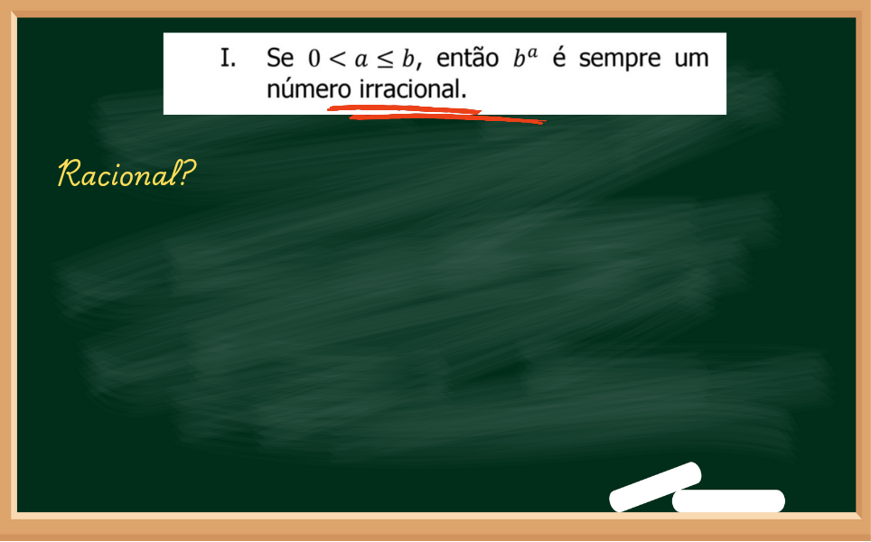 No primeiro item da questão afirma que se a e b são positivos (já que são maiores que zero), se calcular b elevado na a, então o resultado vai ser um IRRACIONAL.