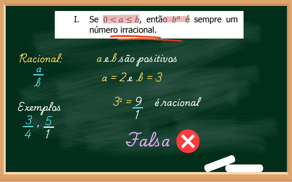 Agora vamos pegar o b elevado na a, logo fica 3², que resulta em 9. Na afirmação diz que o resultado é sempre irracional, mas 9 é racional, logo temos um contra-exemplo, o que nos diz que é uma afirmação falsa.