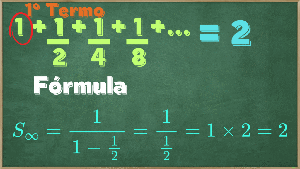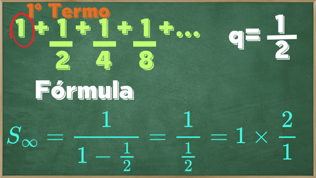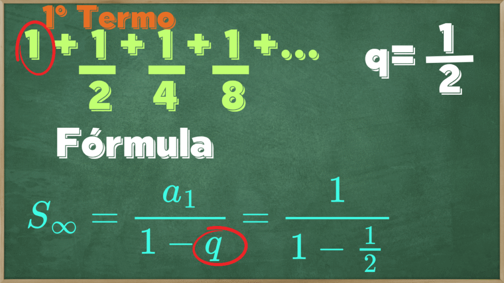 Para utilizar esta fórmula, basta ter o 1º termo (a1) e a razão dos termos desta soma. Se olhar os termos, o 1º termo é o número 1 e a razão 1/2, então basta substituir esses números na fórmula.