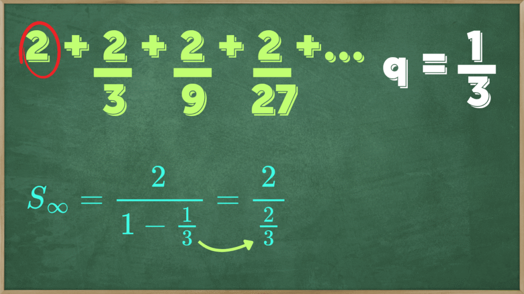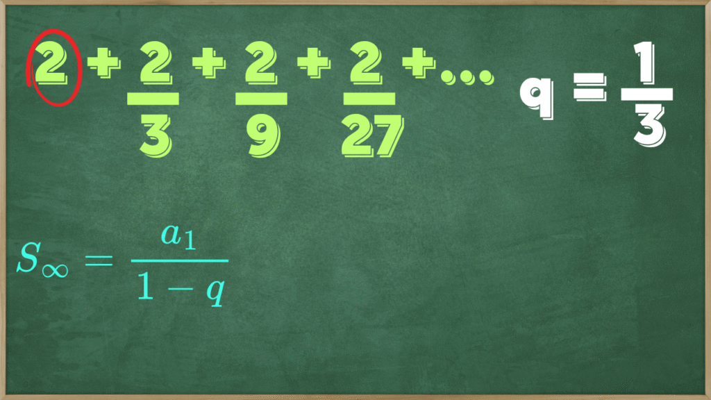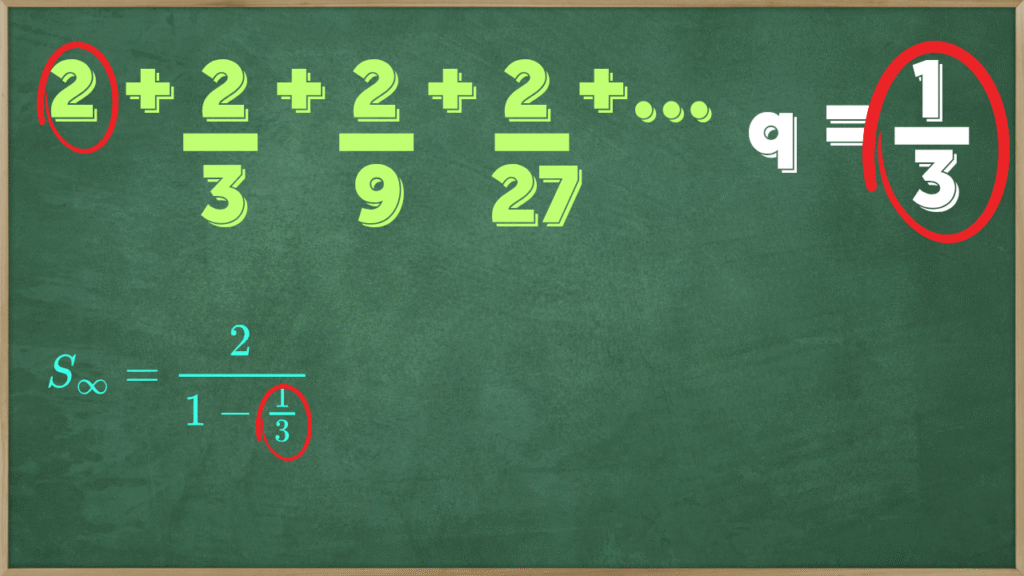 Como o 1º termo (a1) é igual a 2 e a razão q é igual a 1/3, então podemos substituir esses elementos na fórmula.