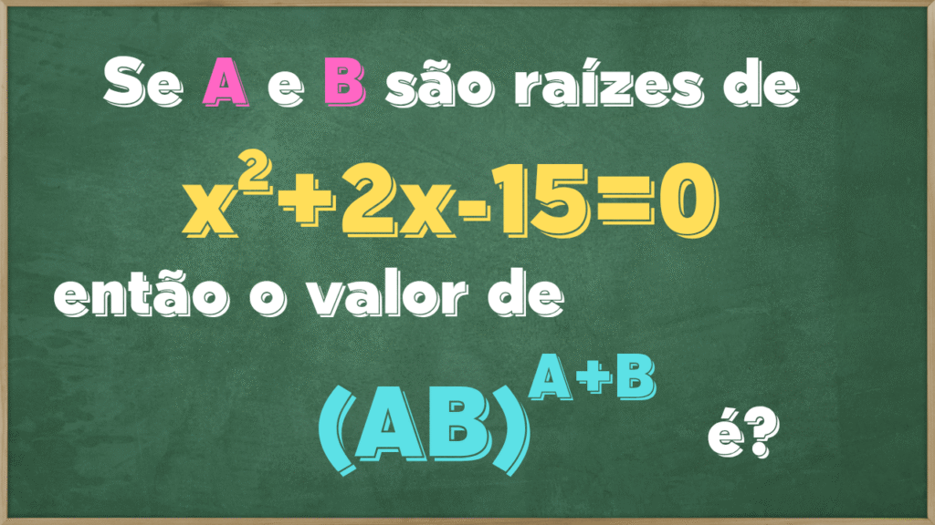 Traduzindo a questão… O exercício nos traz que A e B são raízes da equação x²+2x-15=0, ou seja, resolvendo esta equação, as soluções seriam correspondentes ao A e ao B. Sendo assim, encontrando as raízes, o exercício pede para calcular AB elevado a A+B.