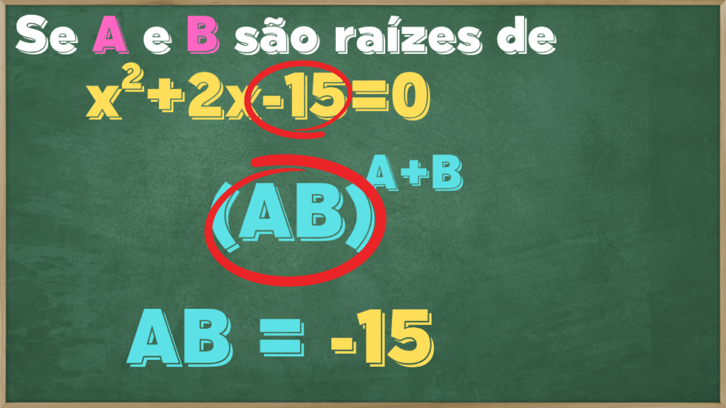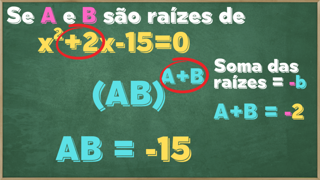 Começando com AB, como é o produto das raízes, pela propriedade o produto das raízes é sempre o valor de “c”. Como “c” na equação é -15, logo AB=-15.