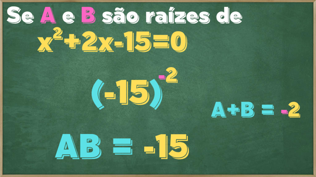 Da mesma forma o A+B, como é a soma das raízes e a propriedade nos diz que a soma das raízes é o “b” com o sinal invertido, e sabendo que o “b” na nossa equação é o +2, logo A+B será -2, isto é, A+B=-2