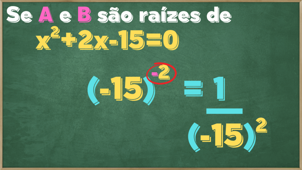 Agora com -15 elevado a -2, basta aplicarmos a propriedade da potência quando o expoente for negativo, o transformando em uma fração, colocando esta potência no denominador desta fração com o numerador igual a 1.