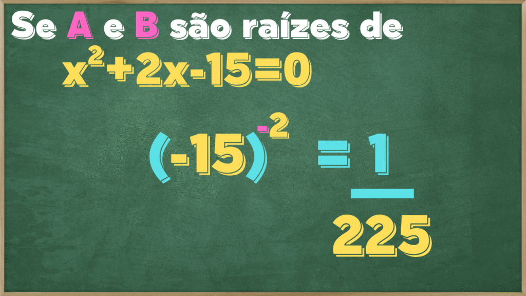 Logo, basta calcular (-15)², o que resultará em 225 positivo, já que (-15)²=(-15)x(-15), onde sinais iguais é “mais” e 15×15 é 225.