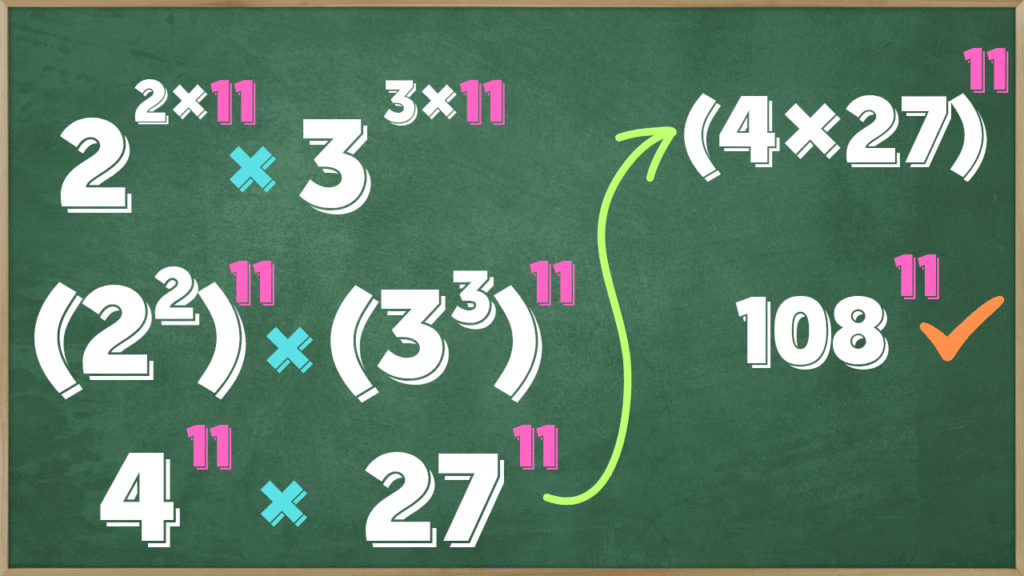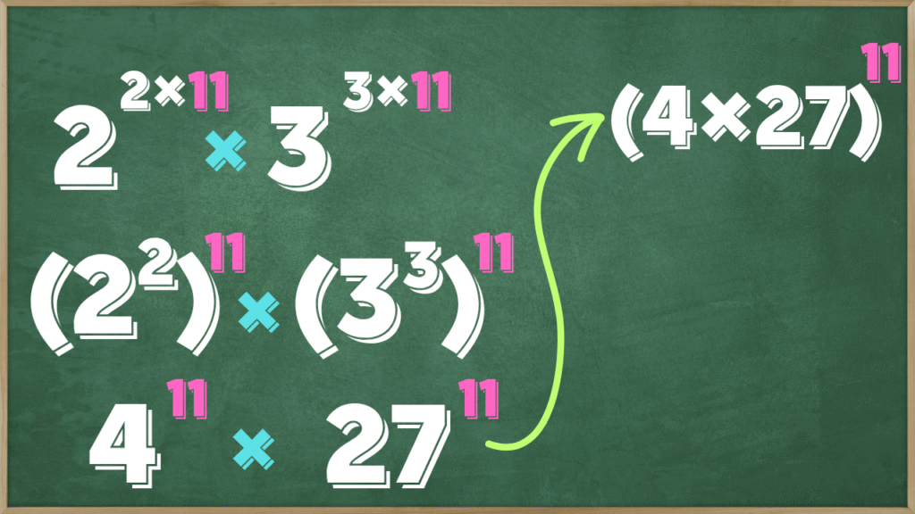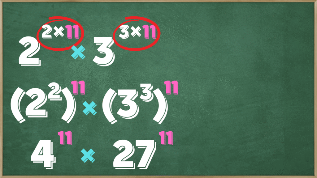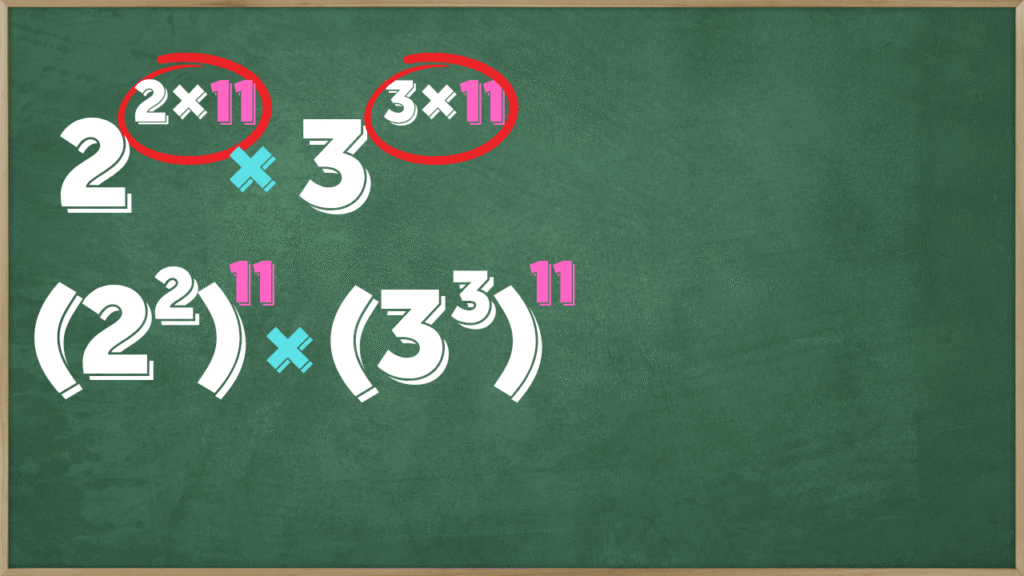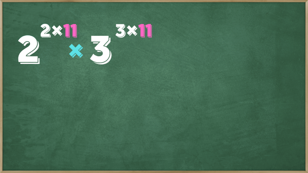 Como podemos aplicar esta propriedade? O 11 é comum aos dois expoentes, por consequência, podemos colocar o 2 e o 3 nas bases e deixar o 11 de fora.